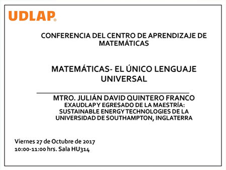Conferencia impartida por el Mtro. Julián David Quintero, ExaUDLAP y Egresado de la maestría Sustainable Energy Technologies de la Universidad de Southampton, Inglaterra.